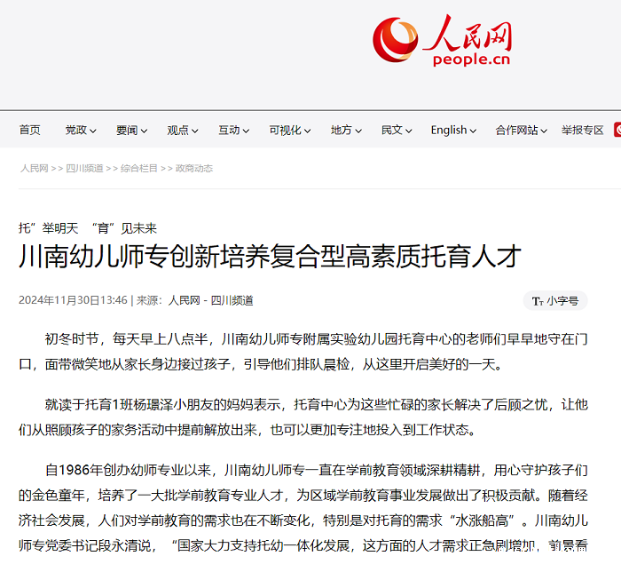 政策有鼓励,市场有需求,家长有需要,学校有基础。川南幼儿师专很早就关注到0-3岁婴幼儿早期教育的市场,成立了儿童早期发展学院,在2020年开设了婴幼儿托育服务与管理专业和早期教育专业。随后,学校不断在这一领域全面布局,致力培养“岗课赛证贯通·医教养护融通”的复合型高素质托育人才,努力实现“精心培育、安心托幼”,更好地服务于地方托育服务体系建设这一基础性民生工程。