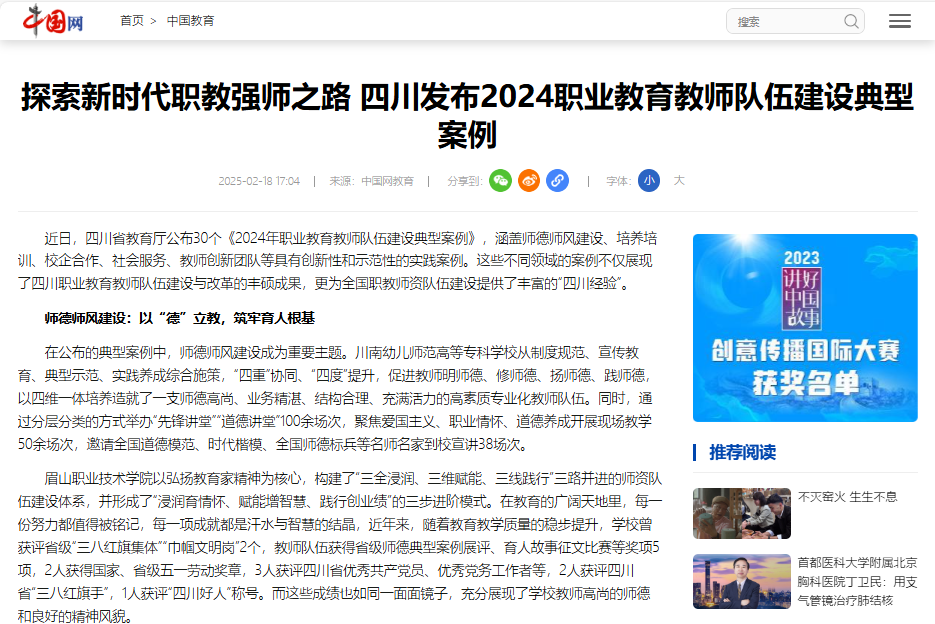 眉山职业技术学院以弘扬教育家精神为核心,构建了“三全浸润、三维赋能、三线践行”三路并进的师资队伍建设体系,并形成了“浸润育情怀、赋能增智慧、践行创业绩”的三步进阶模式。在教育的广阔天地里,每一份努力都值得被铭记,每一项成就都是汗水与智慧的结晶,近年来,随着教育教学质量的稳步提升,学校曾获评省级“三八红旗集体”“巾帼文明岗”2个,教师队伍获得省级师德典型案例展评、育人故事征文比赛等奖项5项,2人获得国家、省级五一劳动奖章,3人获评四川省优秀共产党员、优秀党务工作者等,2人获评四川省“三八红旗手”,1人获评“四川好人”称号。而这些成绩也如同一面面镜子,充分展现了学校教师高尚的师德和良好的精神风貌。