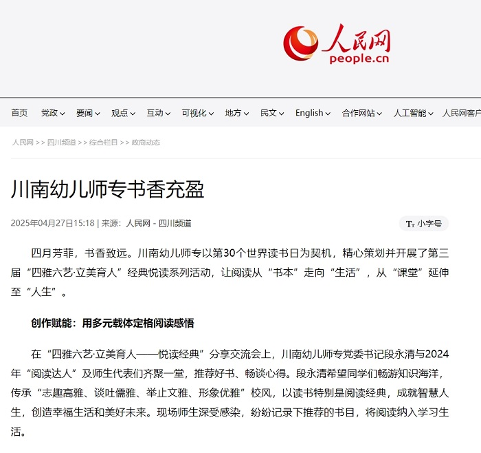 四月芳菲,书香致远。川南幼儿师专以第30个世界读书日为契机,精心策划并开展了第三届“四雅六艺·立美育人”经典悦读系列活动,让阅读从“书本”走向“生活”,从“课堂”延伸至“人生”。